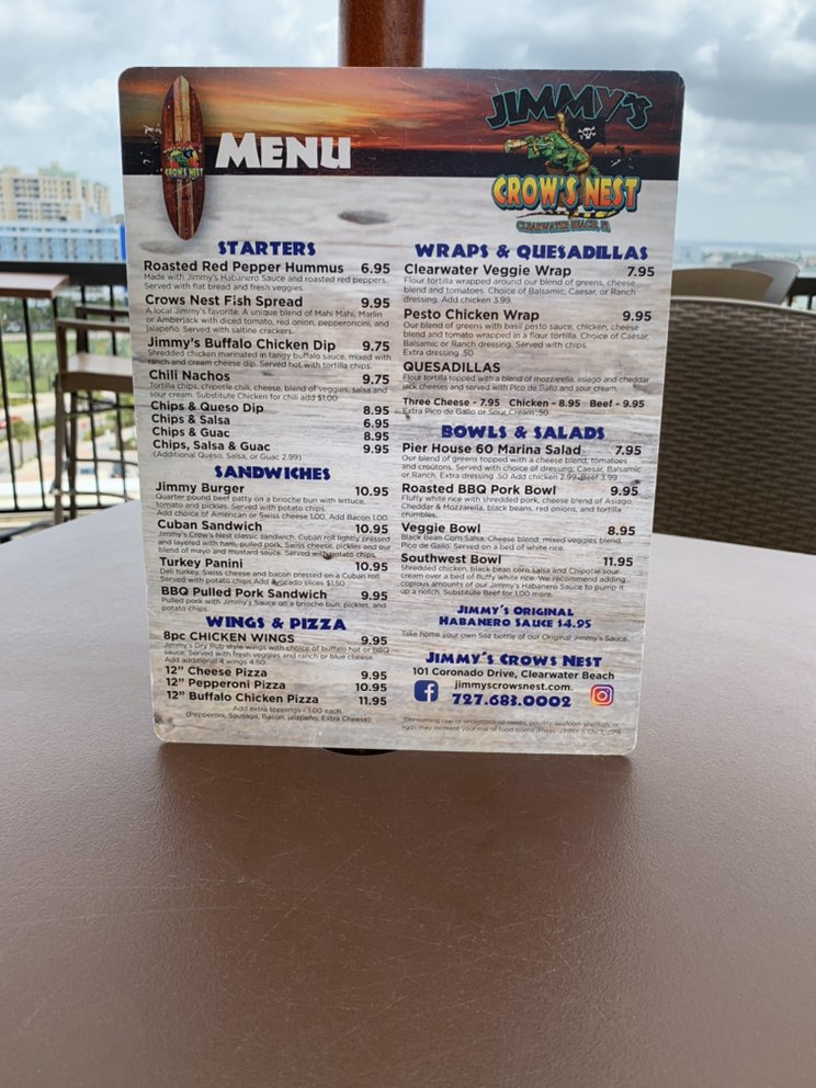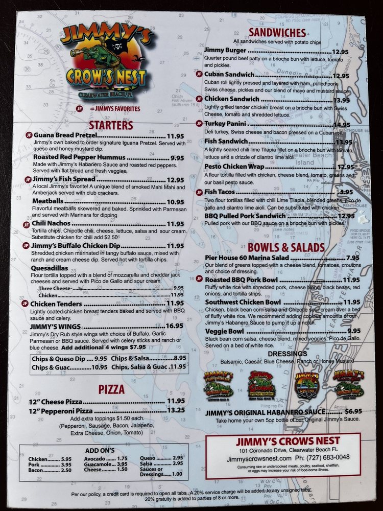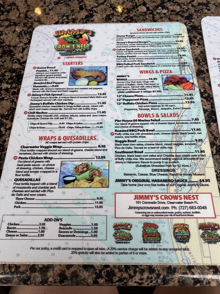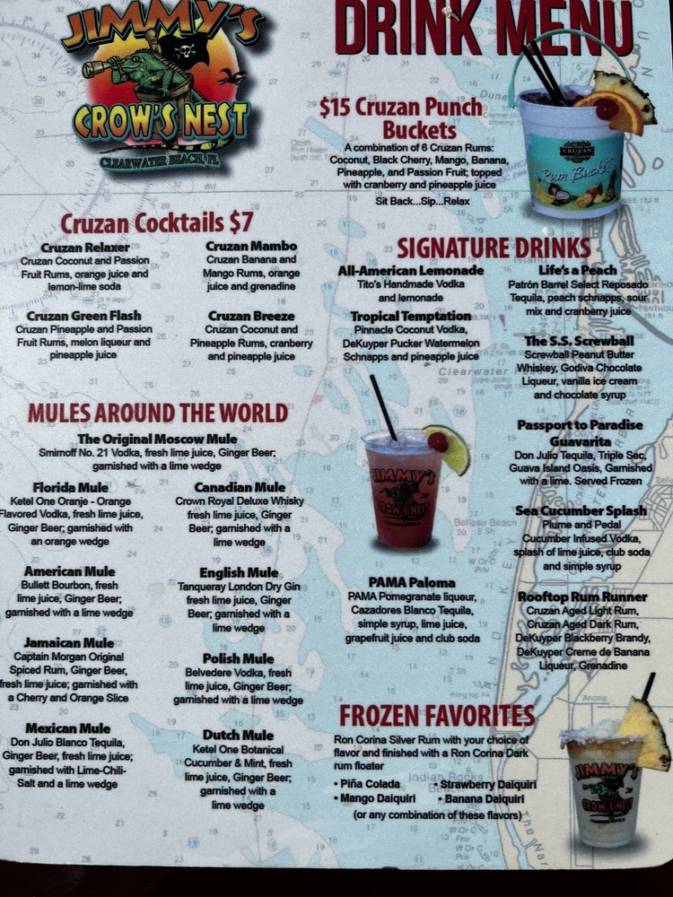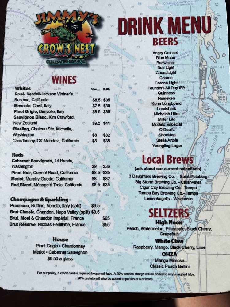 Welcome to Jimmy's Crows Nest, the pinnacle of casual dining in Clearwater, FL, where New American cuisine meets stunning sunset views. Nestled on the roof, this vibrant eatery invites you to unwind with friends or family while savoring a delightful selection of bar favorites. The ambience here is unparalleled, offering heated outdoor seating and a full bar, perfect for enjoying crafted cocktails and complimentary sunset shots.